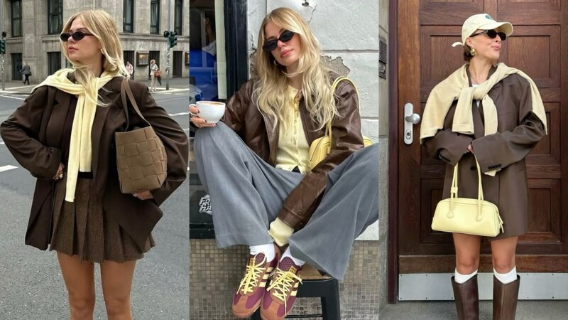 棕色百褶裙 + 鹅黄色针织衫:棕色百褶裙搭配鹅黄色针织衫,甜美又优雅,适合日常出行或约会。