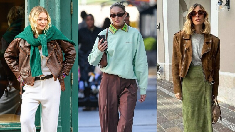 相比鹅黄和宝宝蓝,棕色 + 抹茶绿的组合可能需要更多的搭配技巧。这种色系搭配可以参考一向对色彩组合大胆的超模Gigi Hadid的私服造型。除了将绿色单品用作披肩外,还可以通过上下身撞色的组合来呈现独特的风格。