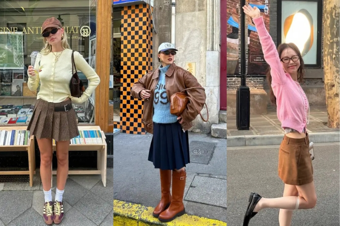 棕色短裙 + 宝宝蓝T恤:棕色短裙搭配宝宝蓝T恤,再配上一双白色运动鞋,轻松营造出休闲又时尚的感觉。