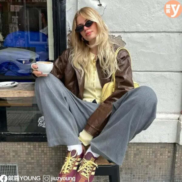 棕色皮夹克 + 鹅黄色T恤:选择一件棕色皮夹克,内搭一件鹅黄色T恤,下身搭配牛仔裤,既时尚又充满活力。